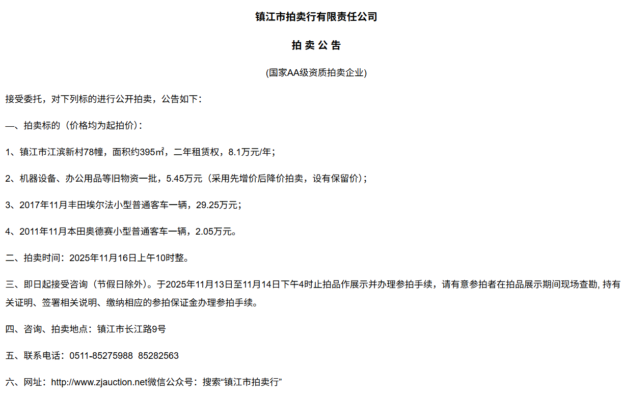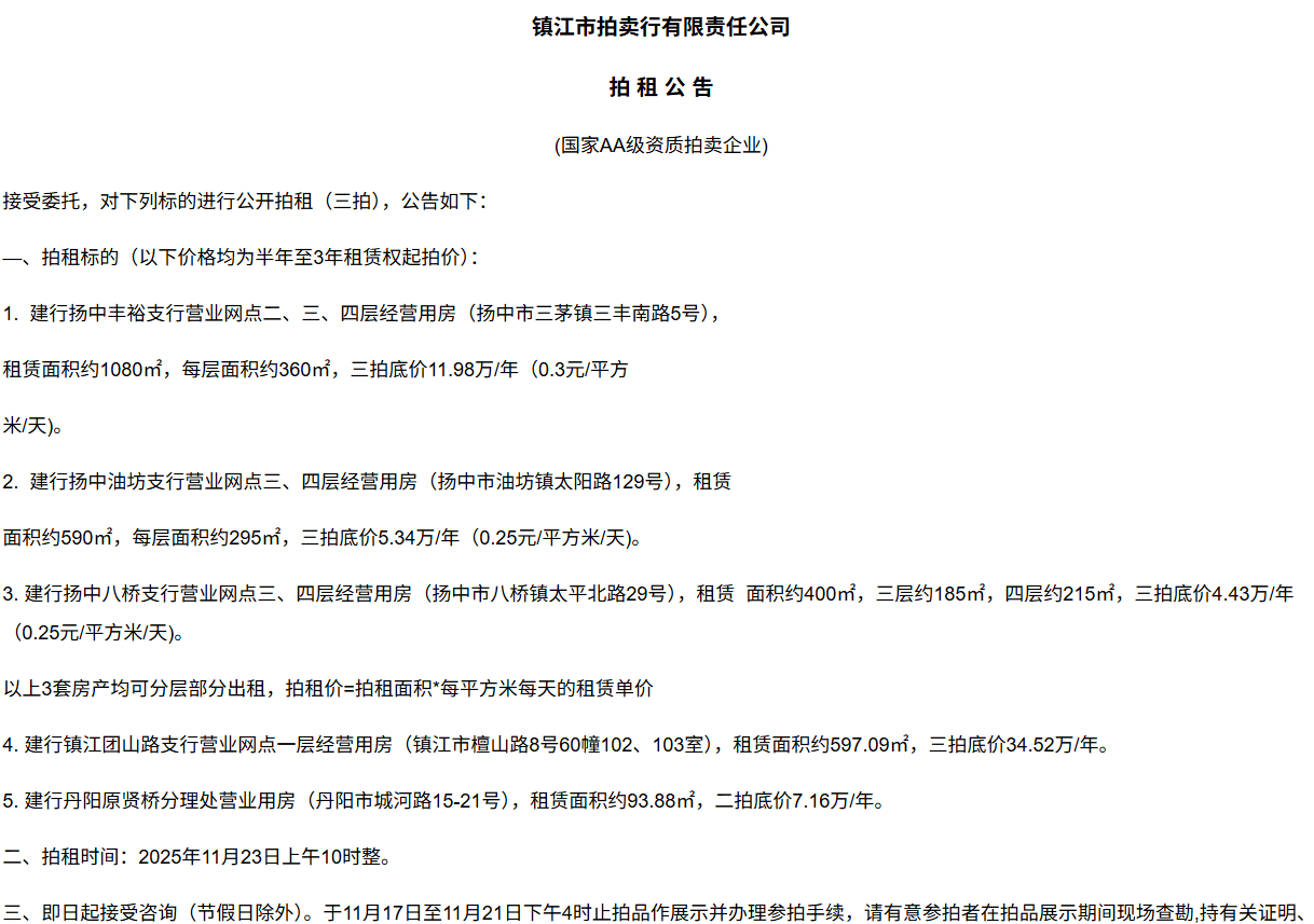 鎮江市拍賣行有限責任公司拍 租 公 吿(國家AA級資質拍賣企業)接受委托,對下列標的進行公開拍租(三拍),公告如下:—、拍租標的(以下價格均為半年至3年租賃權起拍價):1.  建行揚中豐裕支行營業網點二、三、四層經營用房(揚中市三茅鎮三豐南路5號),租賃面積約1080㎡,每層面積約360㎡,三拍底價11.98萬/年(0.3元/平方米/天)。2.  建行揚中油坊支行營業網點三、四層經營用房(揚中市油坊鎮太陽路129號),租賃面積約590㎡,每層面積約295㎡,三拍底價5.34萬/年(0.25元/平方米/天)。3. 建行揚中八橋支行營業網點三、四層經營用房(揚中市八橋鎮太平北路29號),租賃  面積約400㎡,三層約185㎡,四層約215㎡,三拍底價4.43萬/年(0.25元/平方米/天)。以上3套房產均可分層部分出租,拍租價=拍租面積*每平方米每天的租賃單價4. 建行鎮江團山路支行營業網點一層經營用房(鎮江市檀山路8號60幢102、103室),租賃面積約597.09㎡,三拍底價34.52萬/年。5. 建行丹陽原賢橋分理處營業用房(丹陽市城河路15-21號),租賃面積約93.88㎡,二拍底價7.16萬/年。二、拍租時間:2025年11月23日上午10時整。三、即日起接受咨詢(節假日除外)。于11月17日至11月21日下午4時止拍品作展示并辦理參拍手續,請有意參拍者在拍品展示期間現場查勘,持有關證明、簽署相關說明、繳納相應的參拍保證金辦理參拍手續。四、咨詢、拍租地點:鎮江市長江路9號五、聯系方式:0511-85275988   13655299933楊先生六、網址:http://www_zjauction_net.z246.cn;微信公眾號:搜索“鎮江市拍賣行” 拍品清單2025.11.23序號名稱起拍價(元)標的說明1建行揚中豐裕支行營業網點二、三、四層經營用房(揚中市三茅鎮三豐南路5號),租賃面積約1080㎡,每層面積約360㎡三拍底價11.98萬/年(0.3元/平方米/天)1、1-3號房產均可分層部分出租,拍租價=拍租面積*每平方米每天的租賃單價;2、意向競拍人在拍賣前需持營業執照或身份證與委托方說明租賃房產經營業態,確定意向后出具房產承租用途承諾書,經委托方審核后,方可交納保證金參加競拍;3、租賃期限為半年至3年(承租方與出租方協商而定),承租方每半年或一年結付租金,租賃期間的水、電費用及其它相關費用均由承租方承擔;4、承租方不得用于經營和保管危險物品,不得用于開設餐飲、娛樂等可能嚴重影響消防安全、運營安全的經營業態,不得用于經營委托貸款、小額貸款等可能冒用委托方名義,帶來聲譽風險的經營業態。租賃期內,承租方不得破壞墻體結構,自行成就消防、安全等使用條件,不得擅自將租賃房屋轉租、轉讓給他人使用,否則委托方有權收回房屋;5、拍租成交后,承租方將租金交至出租方指定賬戶,傭金交至拍賣方賬戶(拍租傭金為該房屋一個月租金)。承租方憑租賃合同無息退還保證金。2建行揚中油坊支行營業網點三、四層經營用房(揚中市油坊鎮太陽路129號),租賃面積約590㎡,每層面積約295㎡三拍底價5.34萬/年(0.25元/平方米/天)3建行揚中八橋支行營業網點三、四層經營用房(揚中市八橋鎮太平北路29號),租賃面積約490㎡,每層面積約245㎡三拍底價4.43萬/年(0.25元/平方米/天)4建行鎮江團山路支行營業網點一層經營用房(鎮江市檀山路8號60幢102、103室),建筑面積約597.09㎡三拍底價34.52萬/年5建行丹陽原賢橋分理處營業用房(丹陽市城河路15-21號),建筑面積約93.88㎡二拍底價7.16萬/年